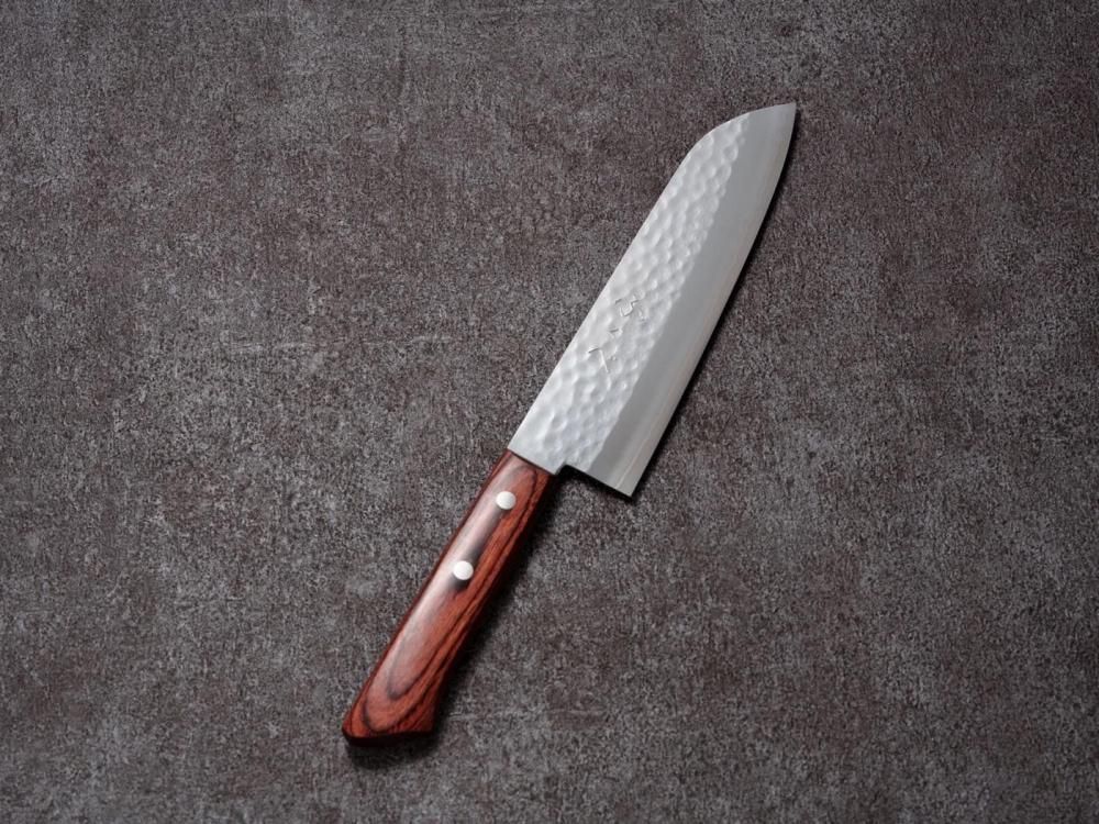 毎日使う道具だから 丈夫で扱いやすいものを選びたい 「ふくべ三徳包丁槌目」は、錆びに強いDPゴールド鋼をステンレスに割り込んで造った、鋭い切れ味と錆にくさを併せ持つ一本です